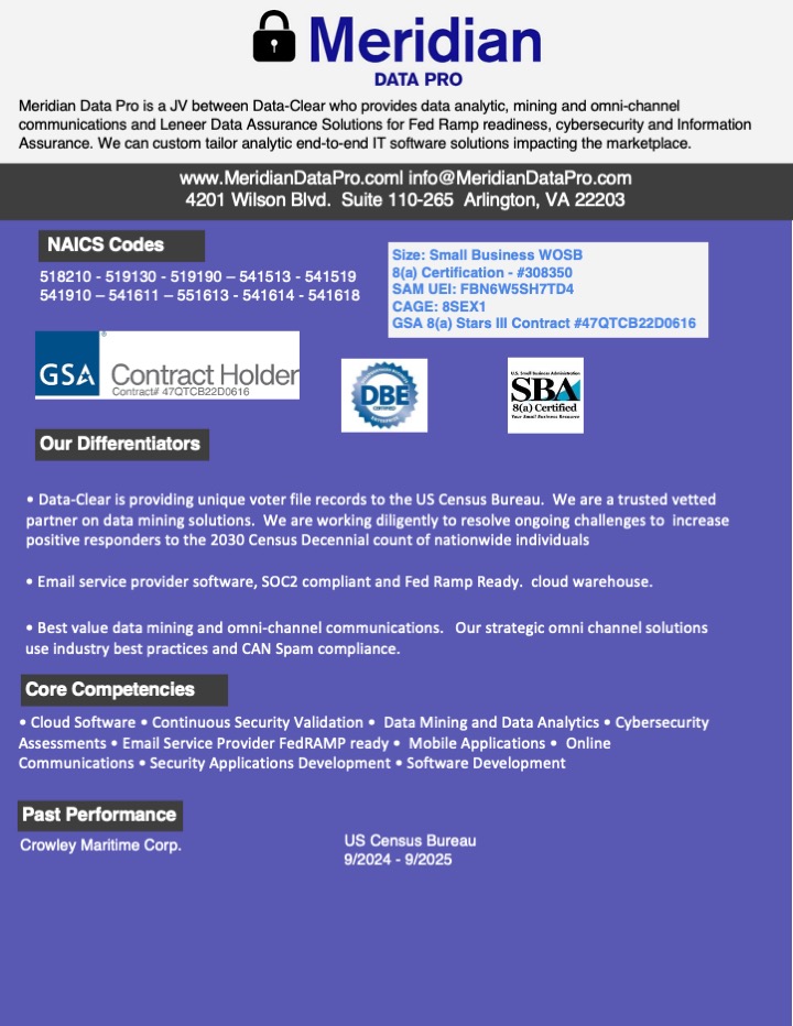 Meridian Data Pro delivers data analytic and omni-channel communications along with FedRAMP readiness and cybersecurity seamless solutions.